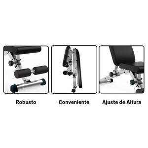El Banco Ajustable de musculación te permite entrenar diferentes ejercicios en un solo espacio, gracias a sus múltiples ajustes, puedes utilizarlo de forma inclinada, plana y declinada, configurándolo de manera fácil para adaptarlo a tus entrenamientos.